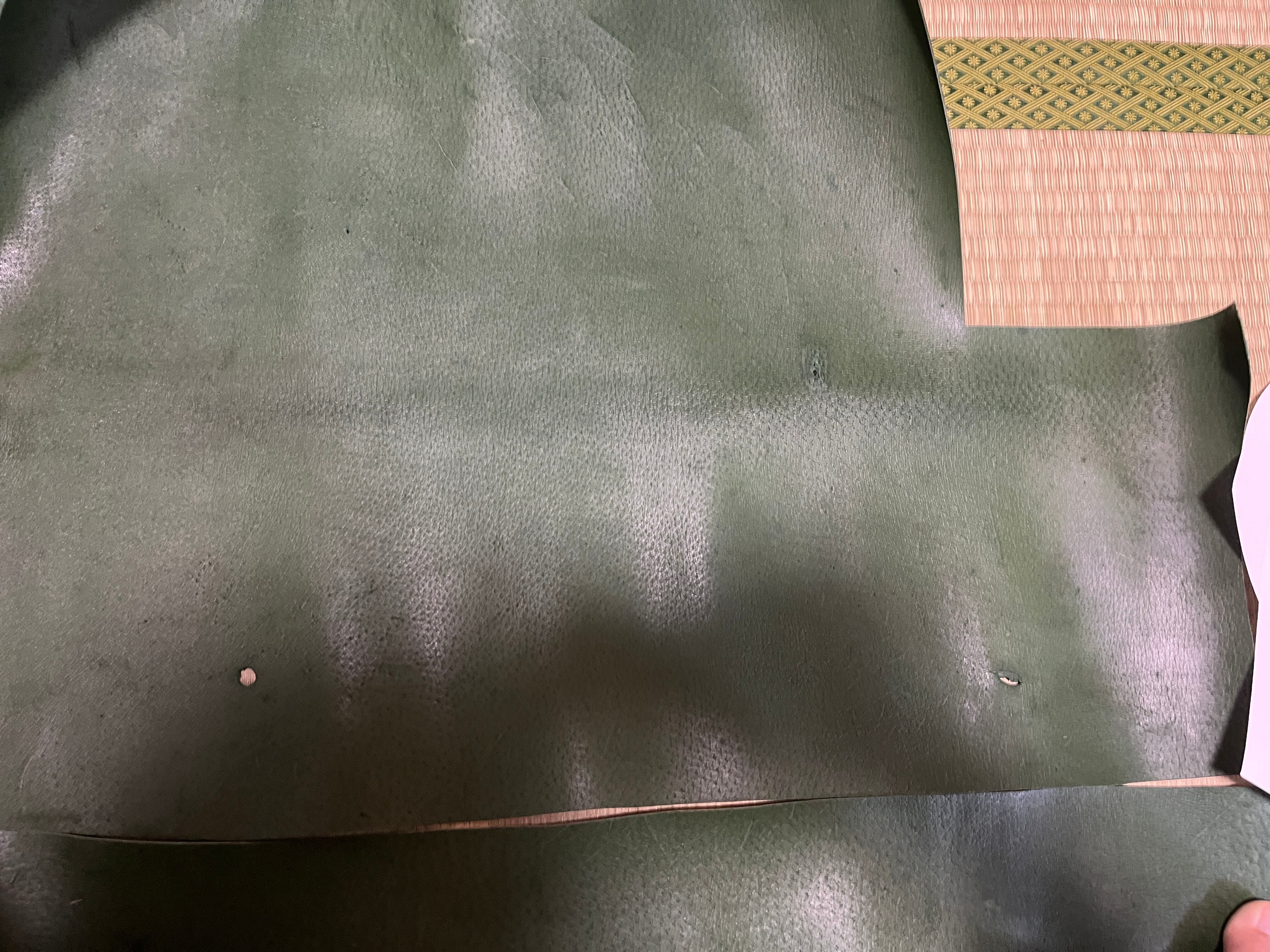革屋国産ジビエレザー専門ブランド VARIEDさんより購入させて頂いた猪革グリーンカラーのお裾分けカットレザーA5サイズです。